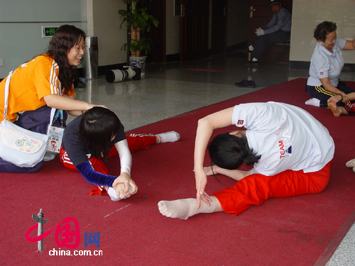 日本運動員在志愿者的幫助下跟著教練拉筋熱身