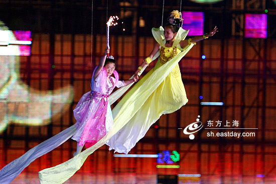 當(dāng)全場(chǎng)沉浸在薩克斯演奏家肯尼·基《梁?!窐非?,并被臺(tái)上演員服裝在黑暗中發(fā)出的點(diǎn)點(diǎn)熒光所吸引時(shí),眼尖的觀眾忽然發(fā)現(xiàn)天空中正有“七仙女”緩緩飄來,隨著涼風(fēng)的吹拂,裙袂翻飛,衣帶飄飄,頗有一股仙氣。一直渴望飛上星空的智障女孩高清瑜也和所有人一樣在抬頭仰望,黃衣“仙女”從天而降,真的帶領(lǐng)她一起飛向遠(yuǎn)方……高清瑜拿著焰火棒,一邊微笑著向下面揮手,一邊漸漸遠(yuǎn)離眾人的視線。觀眾們對(duì)這位可愛的小天使報(bào)以熱烈的掌聲,為她的勇敢,也為她甜蜜的笑容。