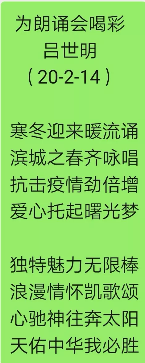 這次詩歌朗誦會(huì)別開生面,始終洋溢著熱烈的氣氛,為抗擊疫情增添力量,取得了圓滿成功。這真是:無礙有愛朗誦群,名家吟詩抗疫情。彰顯愛心獻(xiàn)力量,藝術(shù)天地添一景。在此之前的2月1日,大連市殘疾人朗誦藝術(shù)學(xué)會(huì)還在微信殘疾人朗誦園地專門組織了“為武漢加油”詩歌朗誦會(huì),有10位來自不同崗位的殘疾人朗誦愛好者進(jìn)行了熱情的朗誦,表達(dá)了戰(zhàn)勝疫情的決心。文:李揚(yáng)(遼寧省殘聯(lián)副主席、省肢協(xié)主席)