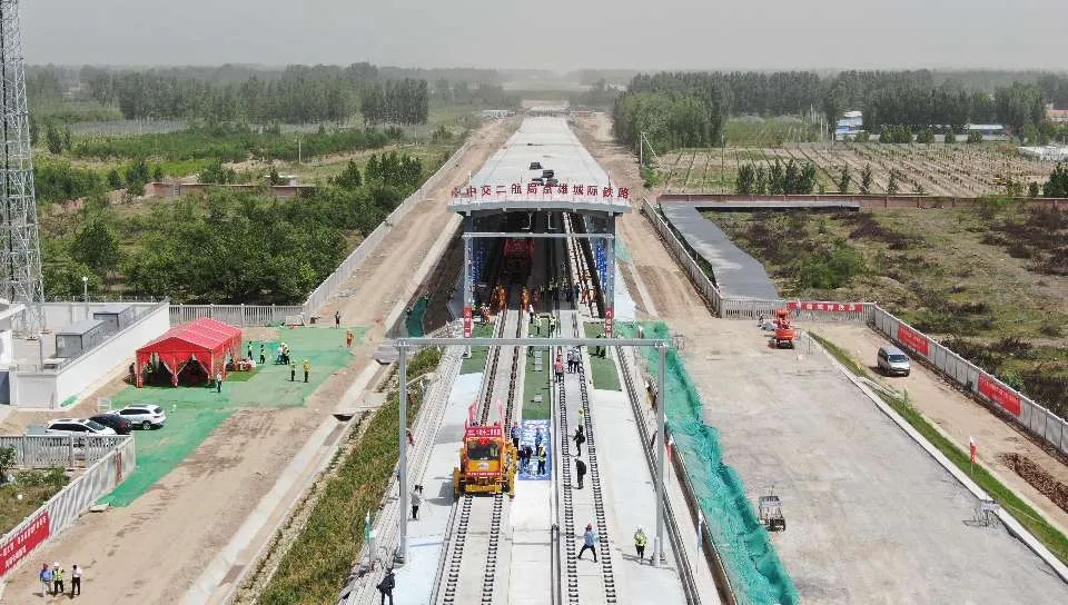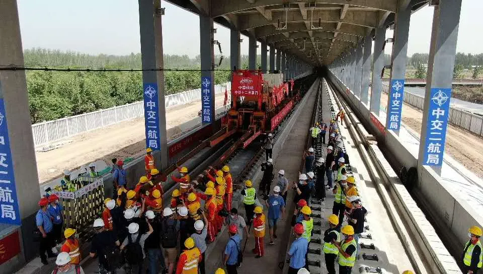 6月3日上午9時28分,在北京至雄安新區(qū)城際鐵路(河北段)鋪軌施工現(xiàn)場,隨著現(xiàn)場指揮人員一聲號令,一組500米長鋼軌從T11運輸車前端緩緩送出,平穩(wěn)落在無砟道床上,標(biāo)志著京雄城際鐵路(河北段)建設(shè)整體從線下施工轉(zhuǎn)入線上軌道鋪設(shè)階段,也意味著京雄城際鐵路(河北段)建設(shè)進(jìn)入最后沖刺階段。