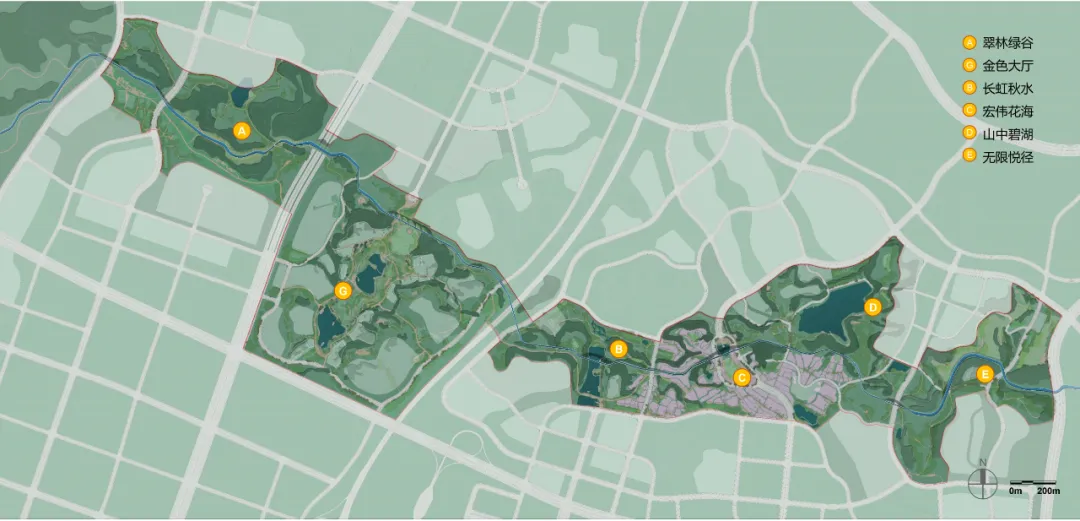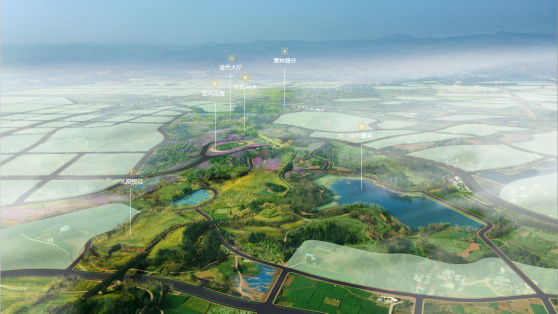 景觀設(shè)計以人民渠為主脈,以最大化地尊重原場地山水肌理與融新城生活入綠色空間為理念,依托基地現(xiàn)狀優(yōu)質(zhì)的山水林盤體系,將風(fēng)景融入新城居民的日常生活,激活并提升場地價值,打造成渝走廊上新時代的山水公園城市