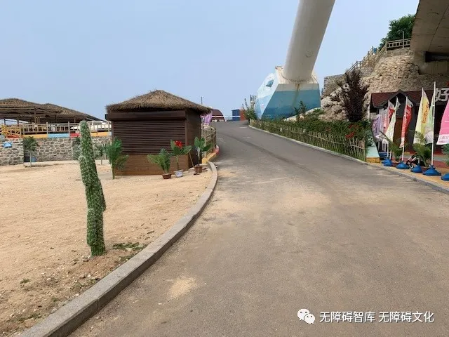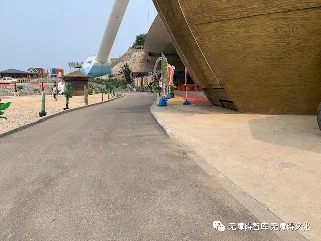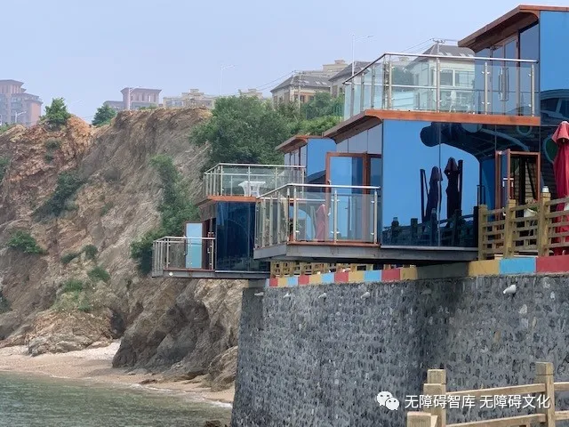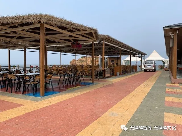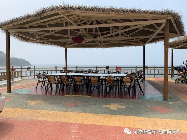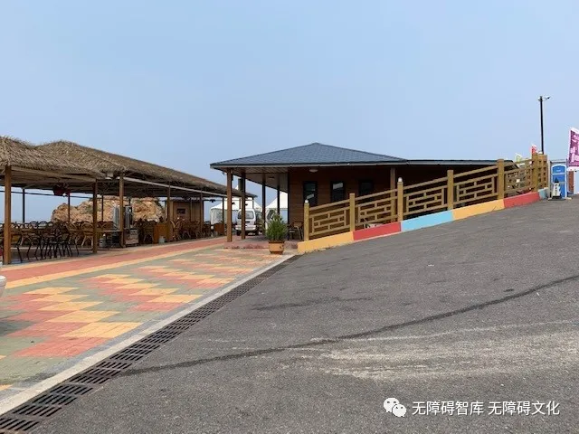 沿著坡路下行可直達觀海平臺、游船碼頭和小浴場。在浴場的旁邊還有幾處餐飲平臺,都設有平緩的入口。雖然這不一定是專為輪行者考慮的,但設計上確實達到了無障礙。地面無高差對接,如果是自己操縱電動輪椅的朋友,在這里不會遇到什么羈絆,可以自由地出入其間。小浴場的更衣間、洗手間尚未開放,只能外觀一下,入口的寬度、所有門的寬度超過800mm而且地面無坎,但內部是否方便不得而知。