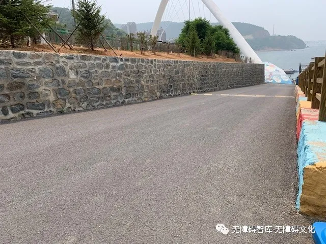 令我沒想到的是,“紅星浴場”一側原本是懸崖峭壁一樣的海邊丘陵地帶,現(xiàn)已全面坡化,雖然坡略顯有些陡,但坡度還是可以滿足電動輪椅自主上下的。走在上面,不時還能看到有推童車的媽媽們和推輪椅帶老人到海邊去看風景的。
