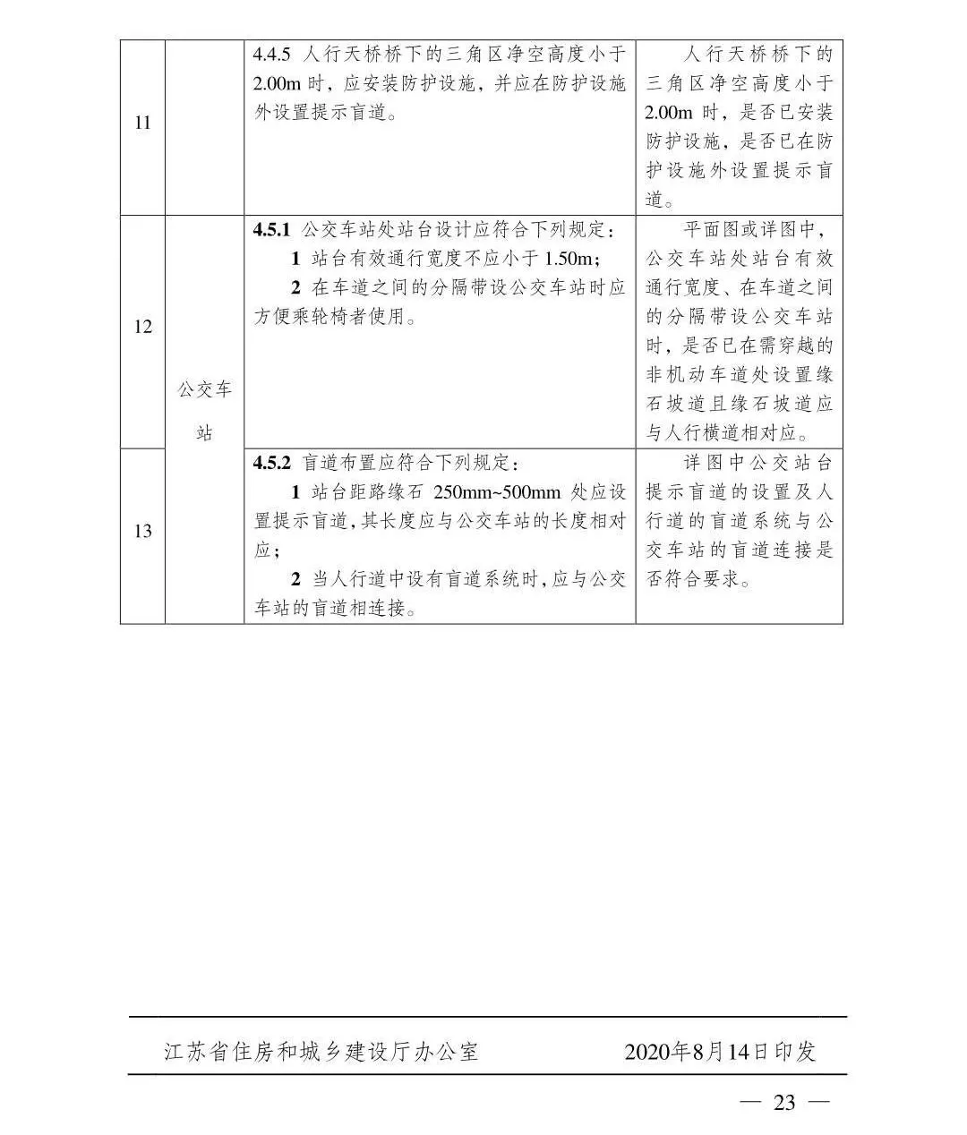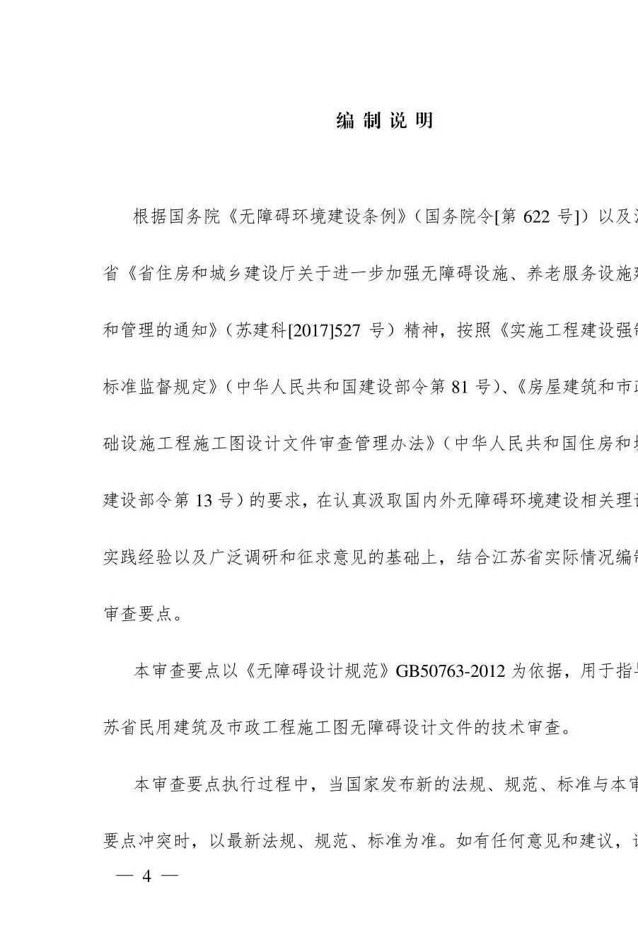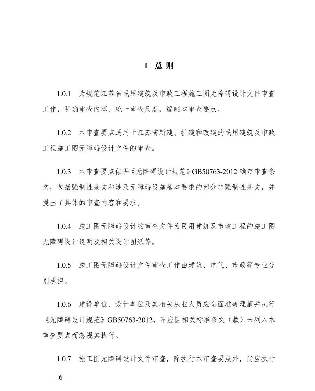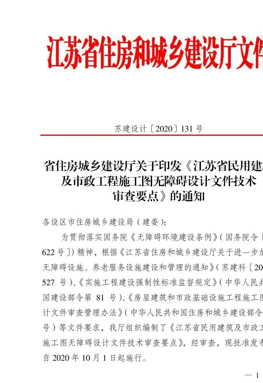 大美無障愛:發(fā)現(xiàn)美 傳遞愛 寫在前面的話 這份文件很重要!它的意義在于全國第一個(gè),具有開先河的意義!值得各地相關(guān)部門學(xué)習(xí)借鑒! 從源頭抓起,從建筑設(shè)計(jì)源頭抓起,讓無障礙在建筑工程中真正落地,不留死角,不留遺憾,不建后再改,不勞民傷財(cái)!一直是近年來無障礙推進(jìn)者和需求者最強(qiáng)烈的呼聲!全國人大代表、中國殘聯(lián)副主席呂世明在全國人大建議中曾提到,我國無障礙環(huán)境建設(shè)快速發(fā)展,成效顯著,但仍存在管理缺失、設(shè)計(jì)標(biāo)準(zhǔn)難以落實(shí)、施工質(zhì)量不達(dá)標(biāo)等問題。因此建議國家有關(guān)部門盡快制定《行業(yè)無障礙專項(xiàng)評審審查認(rèn)證認(rèn)可機(jī)制》,避免無障礙設(shè)施的缺位、形同虛設(shè)或是先建后拆。應(yīng)盡快建立一套行業(yè)無障礙的專業(yè)評審、認(rèn)證、監(jiān)督、驗(yàn)收和處罰機(jī)制,這樣可以從源頭上保證無障礙建設(shè)系統(tǒng)完整、高標(biāo)高質(zhì)。 近日,江蘇省住房和城鄉(xiāng)建設(shè)廳組織編制的《江蘇省民用建筑及市政工程施工圖無障礙設(shè)計(jì)文件技術(shù)審查要點(diǎn)》正式下發(fā),該文件強(qiáng)化機(jī)制,源頭治理,前置審查、措施得力!此舉對我國推進(jìn)高質(zhì)量、高品質(zhì)、全覆蓋無障礙環(huán)境建設(shè)具有重要的現(xiàn)實(shí)意義和深遠(yuǎn)的歷史意義! 在全面步入小康社會的今天,無障礙已成為民用建筑和市政工程不可或缺的重要內(nèi)容。無障礙是衡量建筑和城市建設(shè)的溫度計(jì)。江蘇省住建廳這份文件的出臺,強(qiáng)有力地制止了無視無障礙的設(shè)計(jì),實(shí)施無障礙設(shè)計(jì)圖紙?jiān)搭^審查,這就是要在設(shè)計(jì)師頭腦中固化深化無障礙理念這根弦,任何缺少或不規(guī)范的設(shè)計(jì)都會導(dǎo)致通不過圖紙審查這一關(guān),這種做法的提出是職能部門盡職盡責(zé),對人民負(fù)責(zé)、對國家負(fù)責(zé)、對歷史負(fù)責(zé)的體現(xiàn)!是新時(shí)代綜合治理能力和水平現(xiàn)代化的提升!我們?yōu)?/span>江蘇省住房和城鄉(xiāng)建設(shè)廳點(diǎn)贊!希望各地?zé)o障礙推進(jìn)者認(rèn)真學(xué)習(xí)借鑒江蘇做法,并在當(dāng)?shù)丶右酝茝V和推進(jìn)! 本文件根據(jù)PDF文檔進(jìn)行轉(zhuǎn)載,相關(guān)表格內(nèi)容以圖片形式展示,如給視障者閱讀帶來不便深表歉意,待相關(guān)網(wǎng)站推出后,我號再詳細(xì)轉(zhuǎn)載!