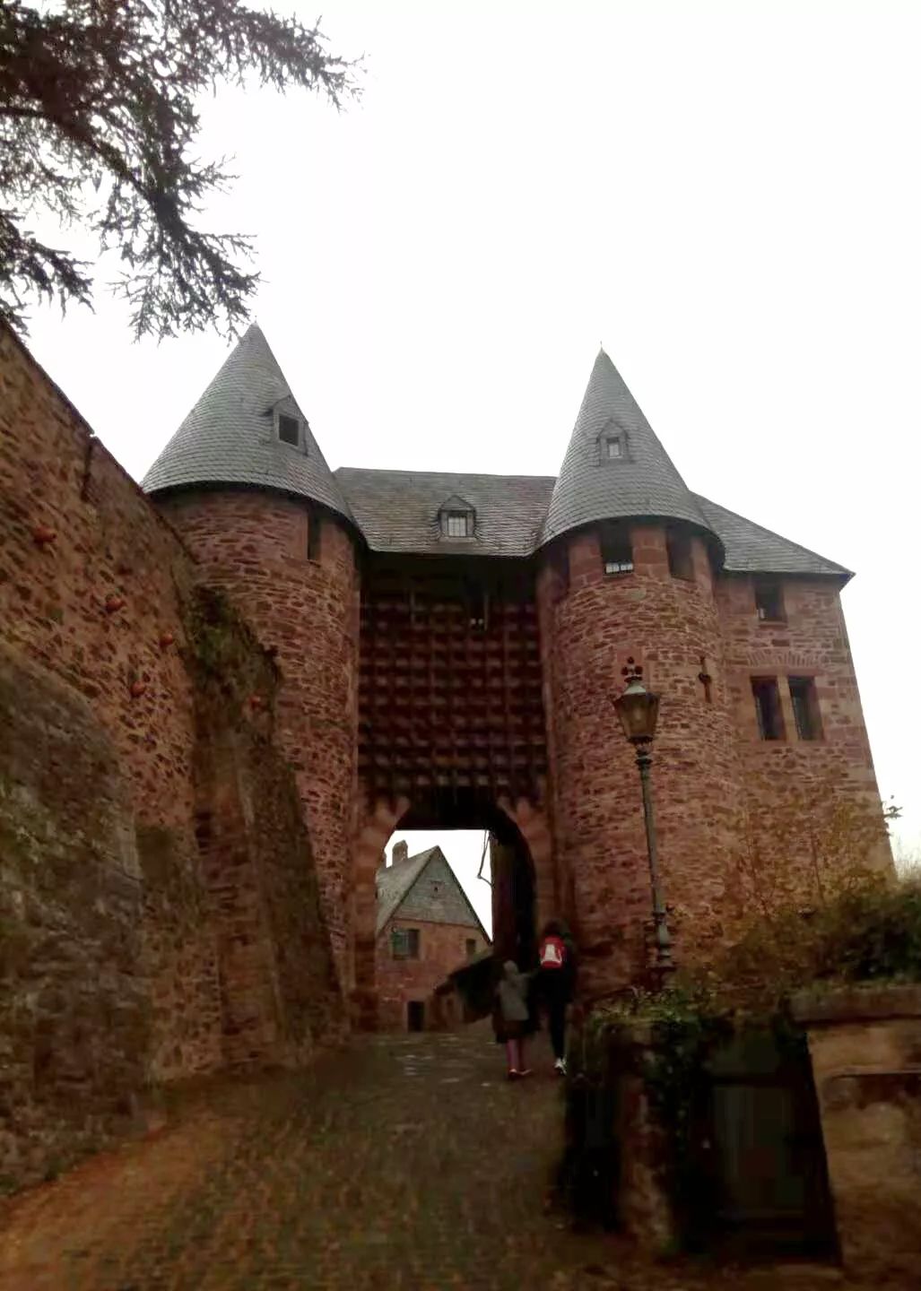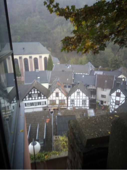 一路上陡坡急彎不斷,好不容易開到了山峰圍繞小溪之上的城堡。這個建于公元十一世紀(jì)的小城堡位于小城海姆巴赫的最高處,一共依山勢修建了幾層。我們到達(dá)的時候,天開始下起綿綿的細(xì)雨,登上城堡最高處,腳下雨霧朦朦中沿溪而建的小城有了點中國水墨畫的韻味。
