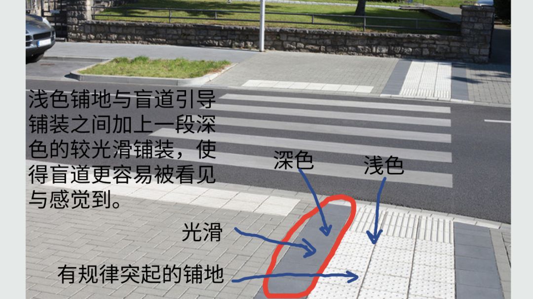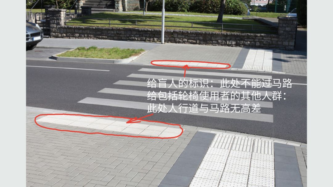 比如城市中隨處可見的人行橫道,按照無障礙規(guī)劃的設(shè)計標(biāo)準(zhǔn)進(jìn)行設(shè)計的時候,就必須查閱景觀相關(guān)規(guī)范,公共空間相關(guān)規(guī)范,以及公共路面標(biāo)識規(guī)范。從這些規(guī)范里,我們可以知道,人行橫道的寬度,人行橫道與路邊停車帶距離,人行橫道與馬路路面最小高差,盲道節(jié)點用什么鋪裝,鋪裝的大小與長度,盲道方向引導(dǎo)用什么鋪裝,鋪裝的方向大小長度......只有全部符合這些規(guī)范的設(shè)計才能通過驗收。
