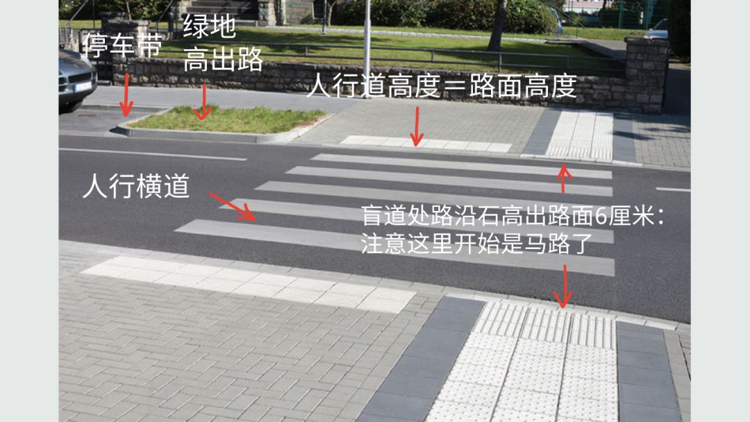 德國居民區(qū)馬路的過街人行橫道【7】。由高出馬路的綠地將過街橫道與馬路邊停車帶分開。