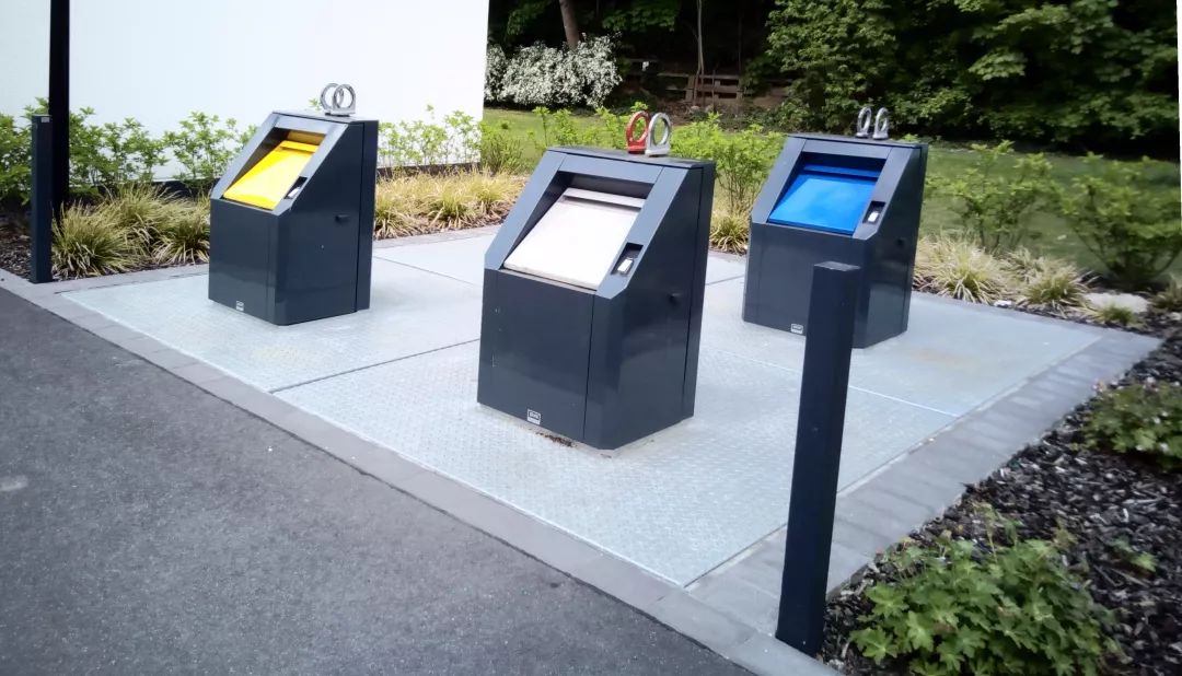 德國生活小區(qū)中的地面下沉式分類垃圾桶。這種下沉式垃圾桶扔垃圾的口只有45厘米高,而且可以坐著輪椅,推著助步車一直到垃圾收集口,即使是行動不便的住戶也可以自己扔垃圾。