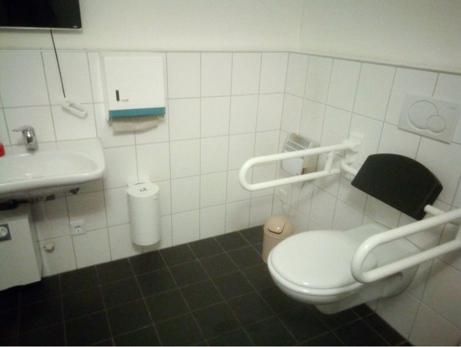 海姆巴赫古城堡內(nèi)的殘疾人標(biāo)準(zhǔn)化衛(wèi)生間:降低洗手池,升高并有扶手靠背的坐便器,緊急求助裝置都是必不可少的。這樣的衛(wèi)生間一般在所有的公共場所都有提供。