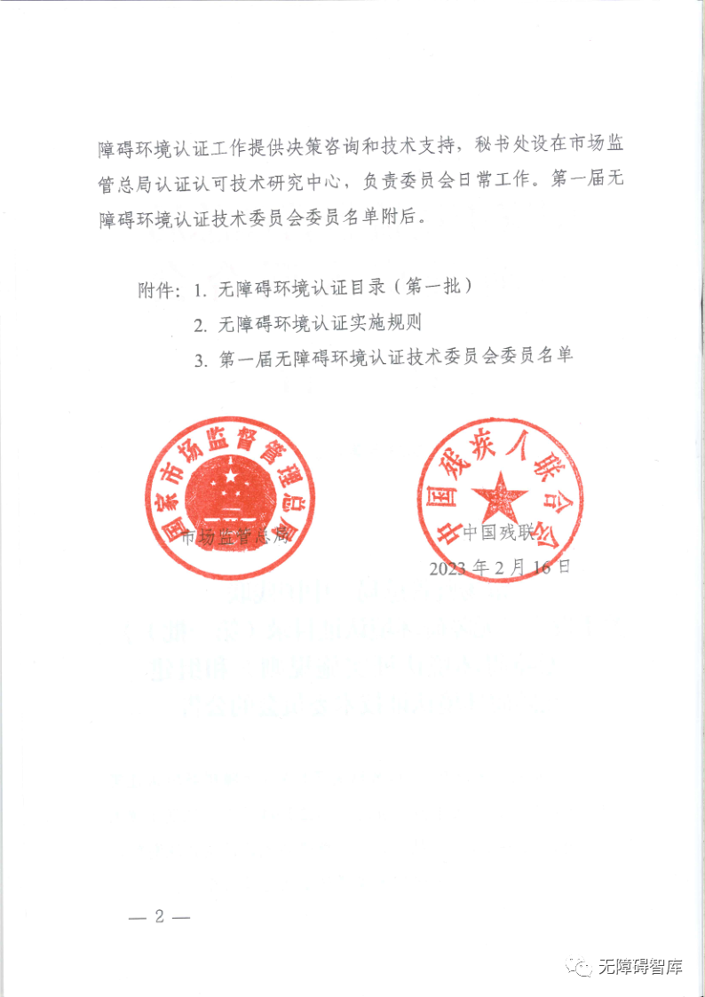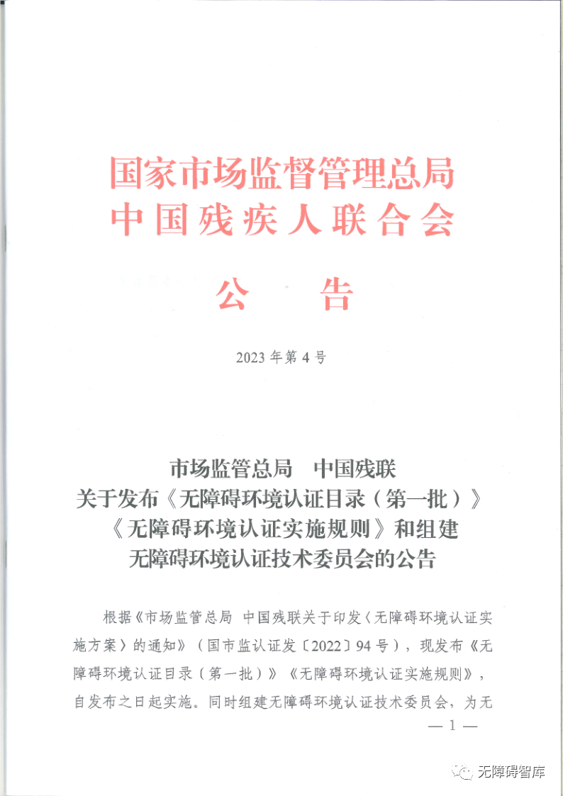 市場(chǎng)監(jiān)管總局 中國(guó)殘聯(lián)關(guān)于發(fā)布《無(wú)障礙環(huán)境認(rèn)證目錄(第一批)》《無(wú)障礙環(huán)境認(rèn)證實(shí)施規(guī)則》和組建無(wú)障礙環(huán)境認(rèn)證技術(shù)委員會(huì)的公告