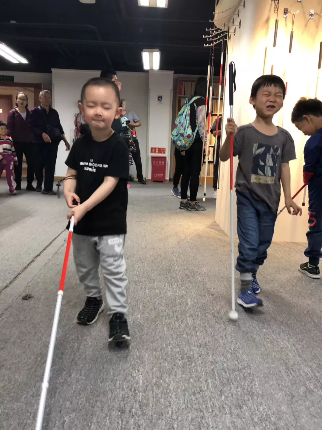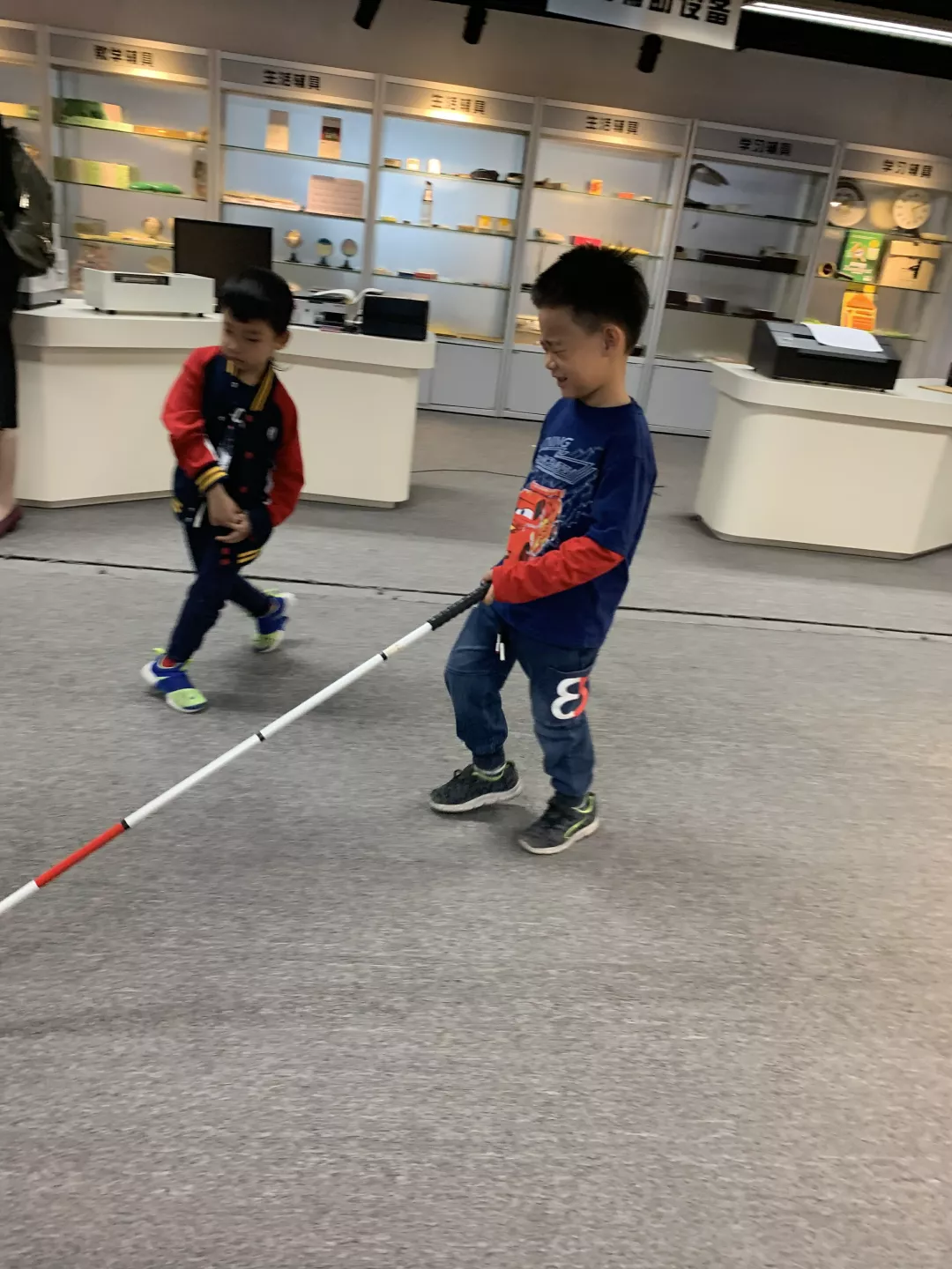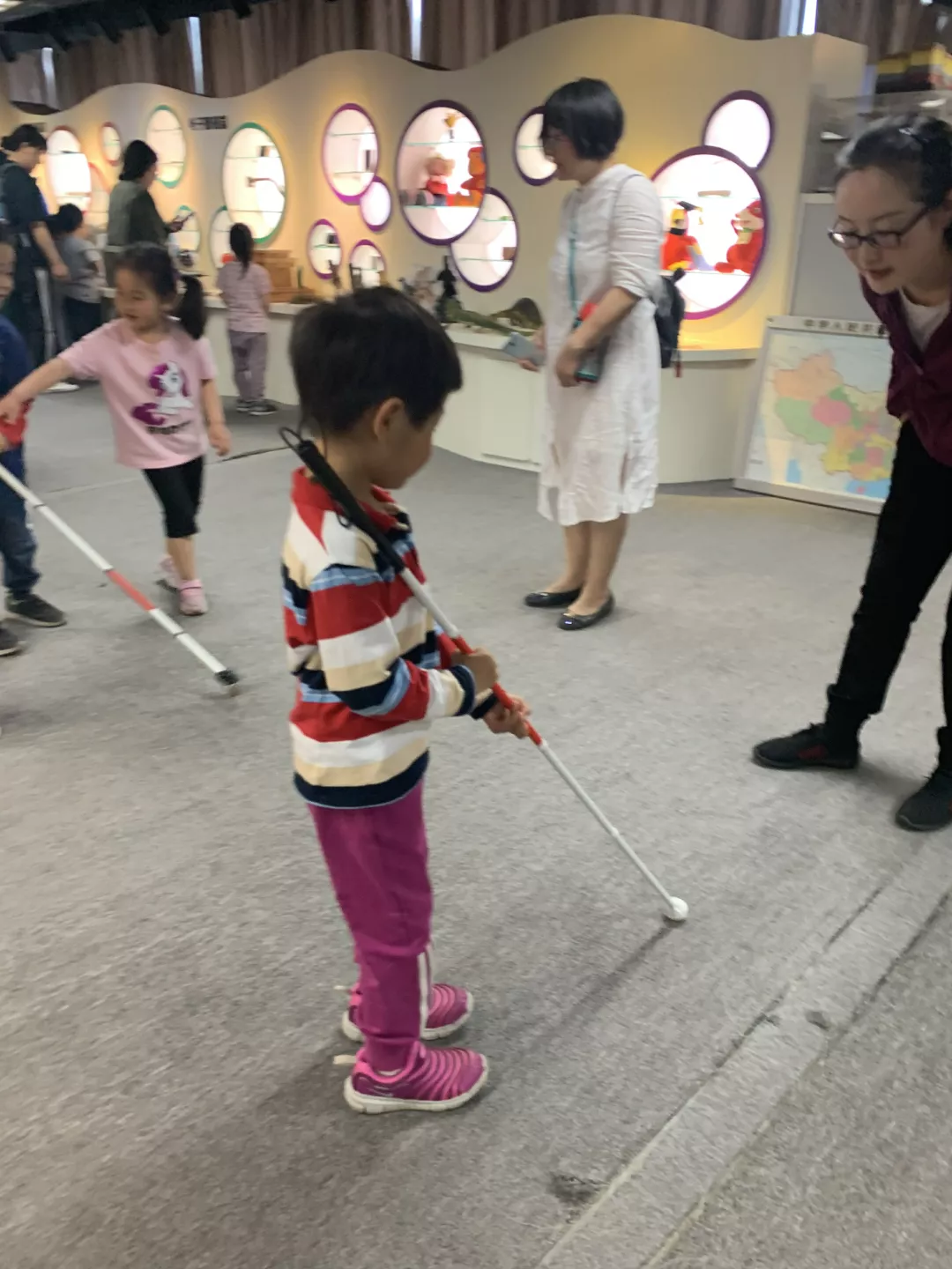 一幅幅精美的作品,展現(xiàn)在孩子們的眼前,孩子們被這偉大的杰作深深的吸引,同時(shí)也體會(huì)到盲人門在創(chuàng)作時(shí)的艱辛。孩子們被他們堅(jiān)持不懈的精神所打動(dòng)。博物館中擺放著的整整齊齊的盲杖,吸引了孩子們。講解員阿姨細(xì)致認(rèn)真的講解著盲杖的作用。孩子們拿起了盲杖,親身感受盲人是怎樣走路的。知道盲杖就像是盲人們的眼睛,是給他們指引方向的。