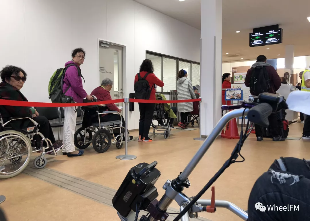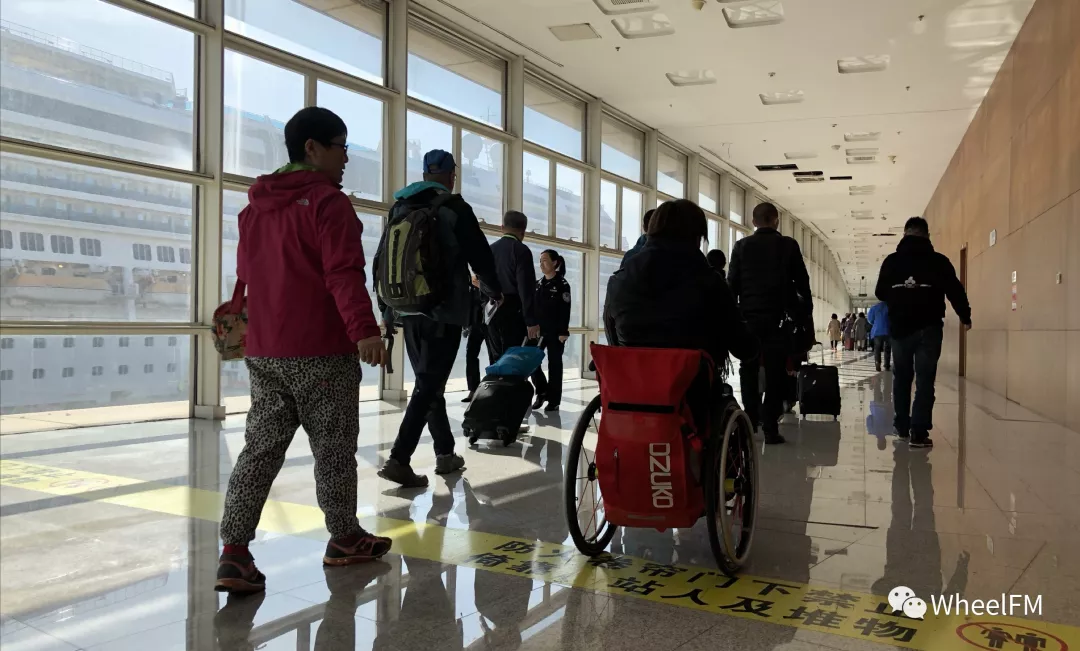 在排隊(duì)安檢的時(shí)候,突然聽(tīng)前邊一位大爺說(shuō),帶的杯子里不能有水,要不喝了要不就得倒了,然后在我們視線里的排隊(duì)的人們都拿出各種形形色色的水杯和水壺開(kāi)始喝水,我估計(jì)他們杯子里泡的不是枸杞就是什么什么的,我和宏姐也開(kāi)始喝,我倆分別用的是個(gè)700ML的杯子,一只手開(kāi)著車頭,一只手端著杯子喝水,到安檢口實(shí)在喝不動(dòng)了,我問(wèn)工作人員,是都得喝了嗎,工作人員笑笑說(shuō),喝一口就行……兩個(gè)大包過(guò)了安檢機(jī),安檢的兩位姑娘開(kāi)始嘀咕,然后其中一位特別嚴(yán)肅的跟我說(shuō),先生,您包里裝了什么?我們通過(guò)顯示屏發(fā)現(xiàn)您包里有大量的管裝物體,這都是什么?呃……我趕緊解釋,這是我們用的衛(wèi)生用品,導(dǎo)尿管,然后我從我輪椅下的小包拿出一根給她看,姑娘表示,明白了…整個(gè)天津游輪母港的無(wú)障礙還是相對(duì)不錯(cuò)的,從無(wú)障礙停車位到緣石坡道,無(wú)障礙衛(wèi)生間也還不錯(cuò)……整個(gè)大廳有兩個(gè)無(wú)障礙衛(wèi)生間。