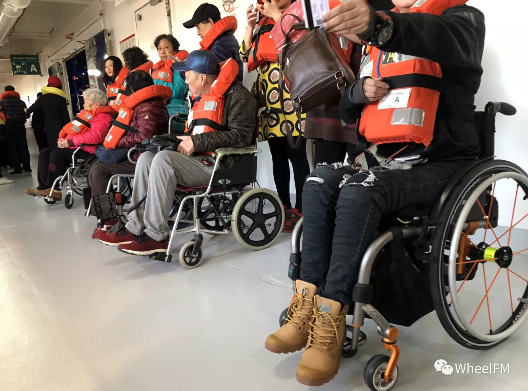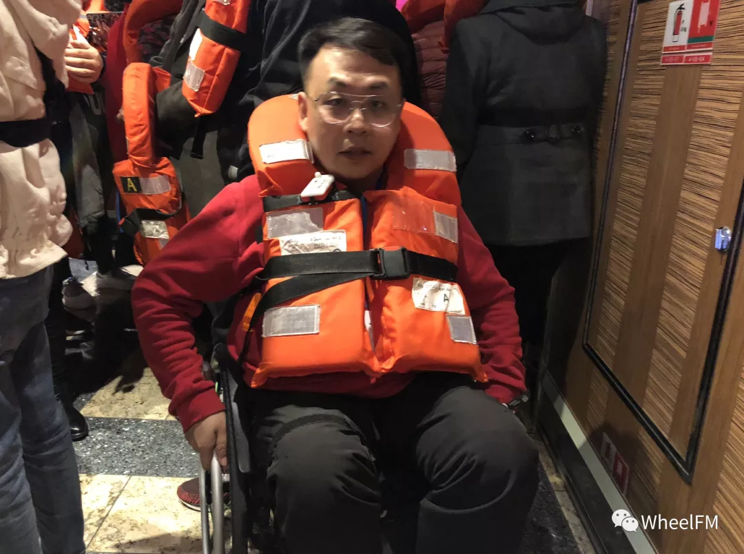 上船第一件事兒是先拍照,綠色背景,一位外籍船員舉著救生圈,和他拍照,后來(lái)才知道,照像免費(fèi),你要想拿到這個(gè)照片是需要付費(fèi)的。上船收拾好以后,一個(gè)最重要的活動(dòng)就是救生演習(xí),要求全體乘客都要參加,每個(gè)房間的衣柜里都有救生衣,大家要穿著救生衣到指定地點(diǎn)集合進(jìn)行救生演習(xí)。壯觀的是,船方會(huì)把所有的輪椅使用者都集中在一起,一排坐著輪椅的人穿上救生衣,真的很難得……