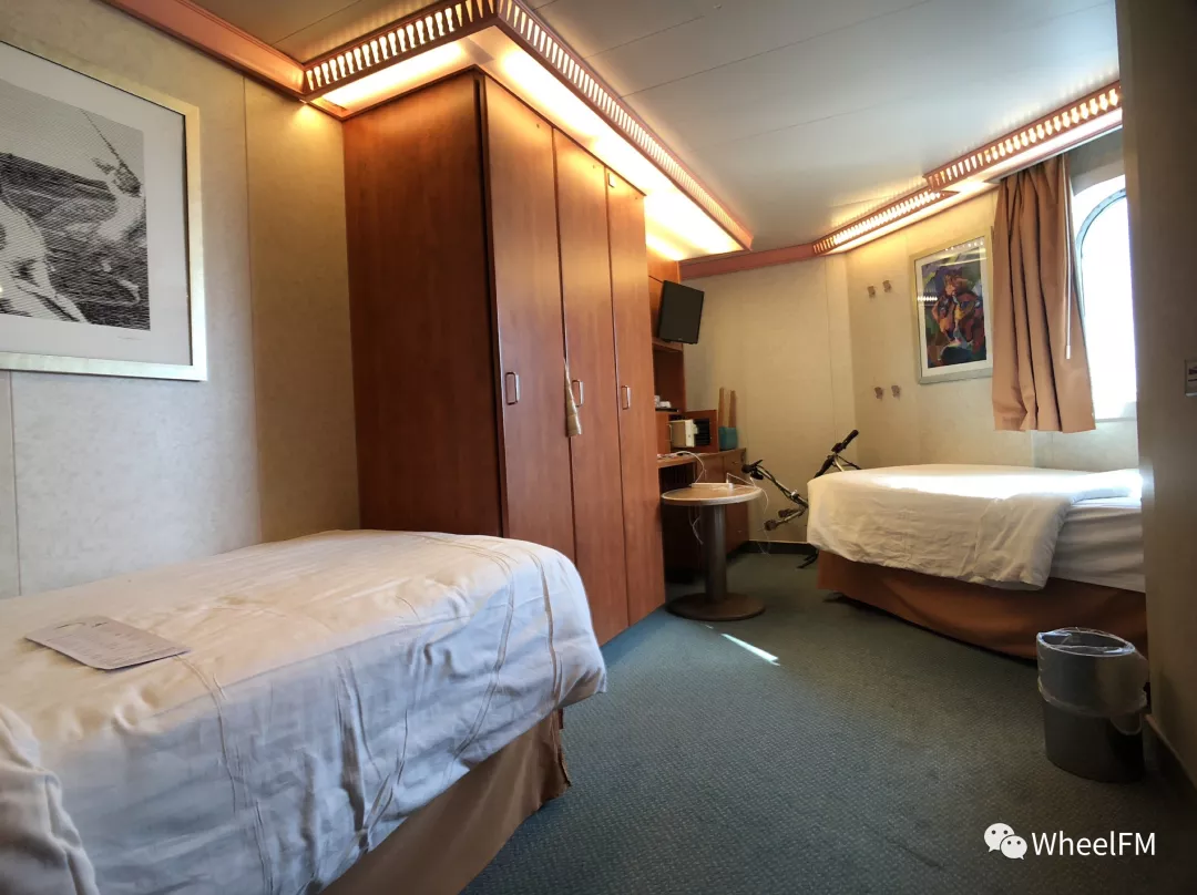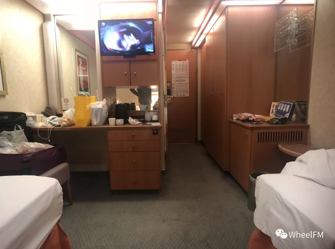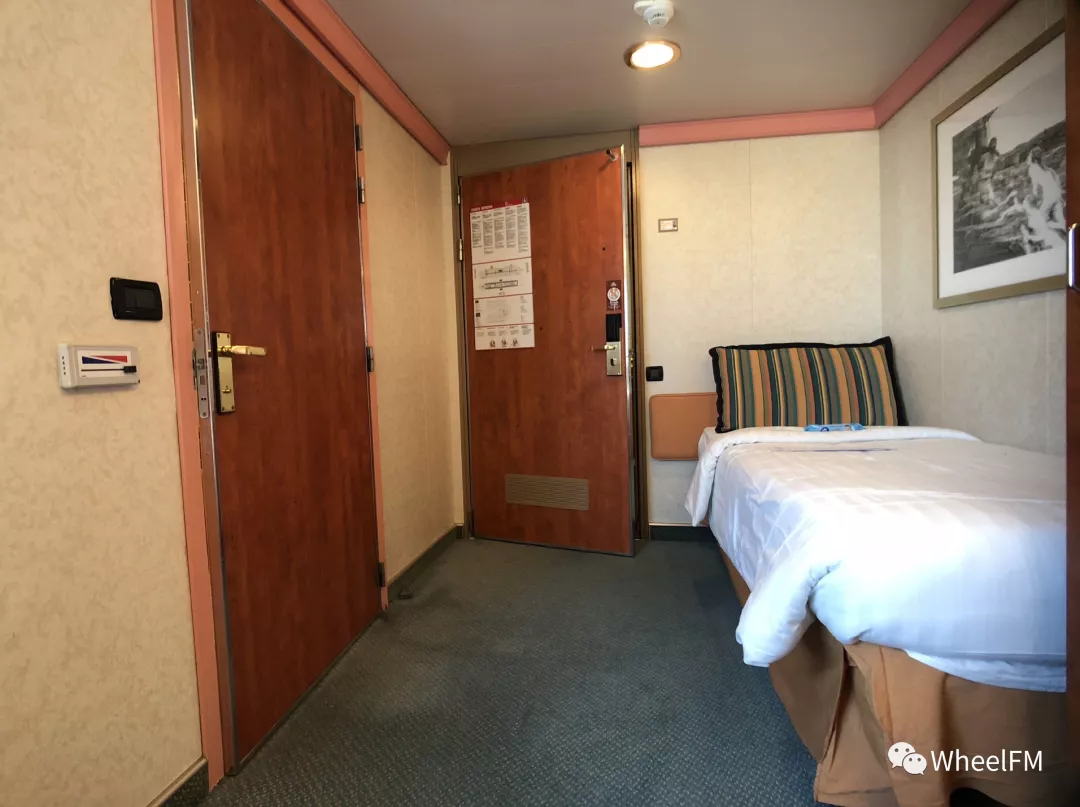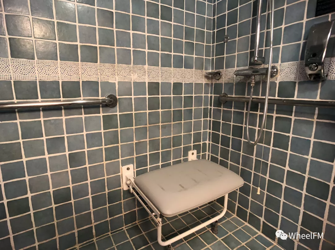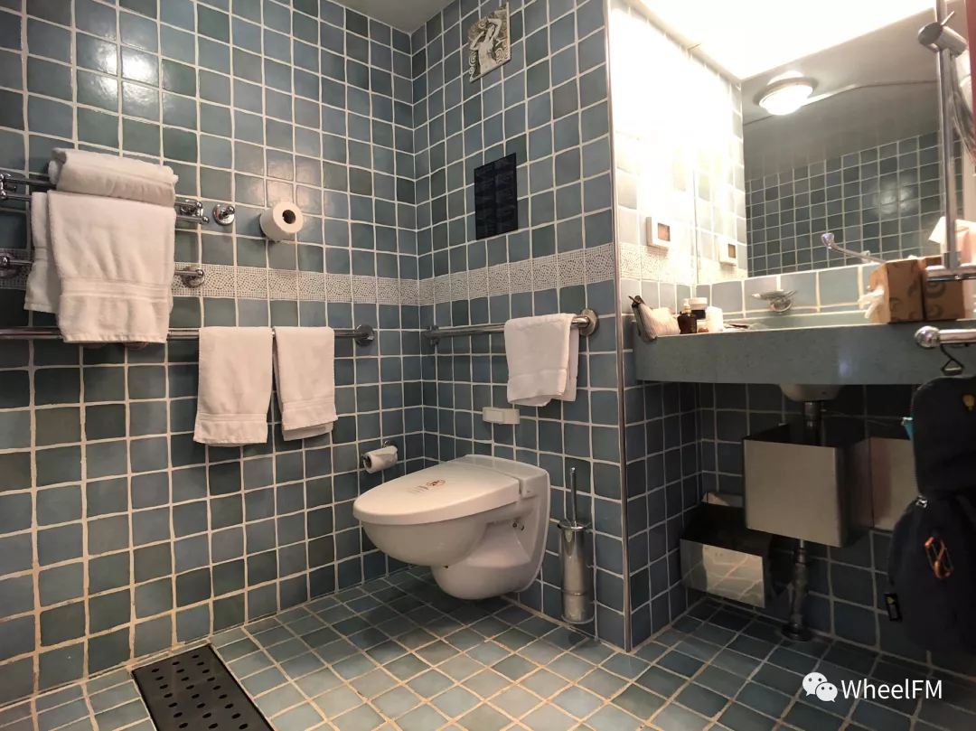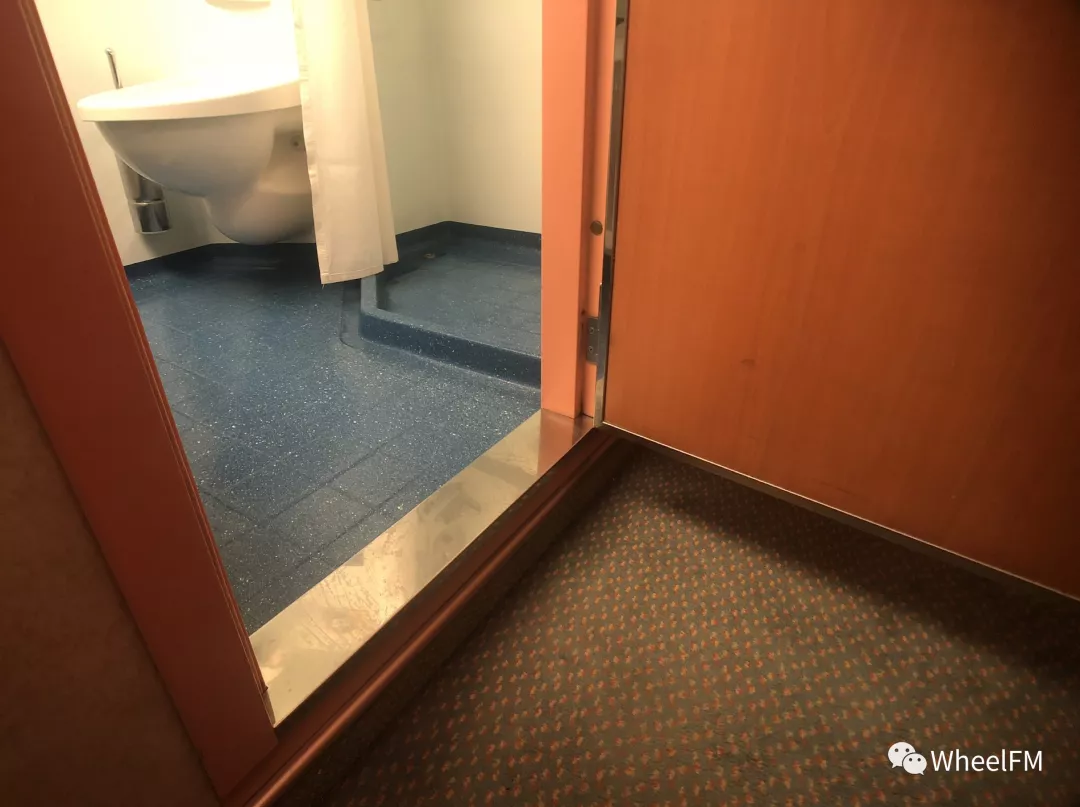 整個(gè)無(wú)障礙房間的門(mén)都比普通房間的門(mén)要寬很多,所有設(shè)施都是低位的,比如低位的開(kāi)關(guān),呼叫裝置等,就是床有點(diǎn)窄,有點(diǎn)高,具體高度因?yàn)闆](méi)帶尺子,所以沒(méi)有量,反正是挺高的。無(wú)障礙衛(wèi)生間也很大,三臺(tái)輪椅在里邊都轉(zhuǎn)的開(kāi),因?yàn)槭且獯罄O(shè)計(jì)的船,他們的無(wú)障礙不標(biāo)準(zhǔn)可能和我們不太一樣,馬桶兩側(cè)沒(méi)有扶手,但是他的浴凳很好,很結(jié)實(shí),也很軟,屁股肉少的小伙伴坐上去也沒(méi)什么問(wèn)題。然后洗手臺(tái)比較高,容膝空間不夠,對(duì)于我們來(lái)說(shuō)只能湊合用。船上的普通內(nèi)倉(cāng)房