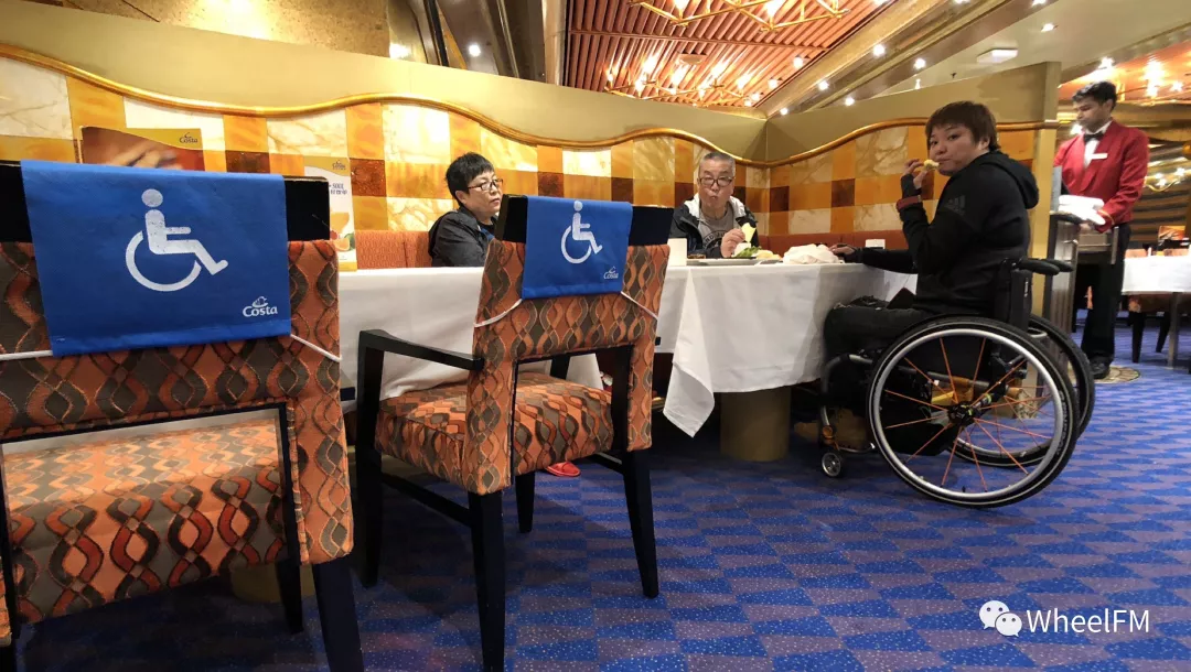 如果去吃飯晚了,有的餐廳的無(wú)障礙坐席還是會(huì)被人占,我們就被抬到了有臺(tái)階的區(qū)域,不過(guò)工作人員還是抬的很專業(yè),同時(shí)被三位來(lái)自不同國(guó)家的帥哥抬,估計(jì)也就是在游輪上了。