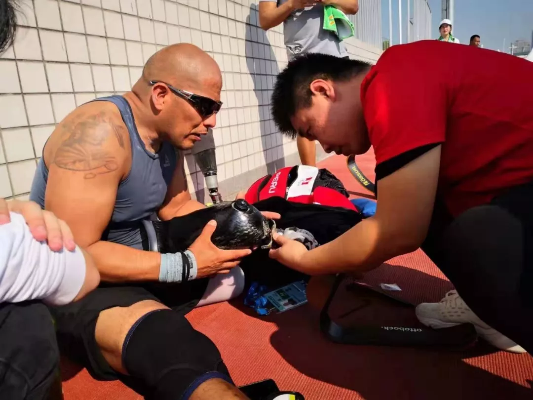 10月20日上午,志愿者在東西湖田徑訓(xùn)練場(chǎng)為秘魯運(yùn)動(dòng)員修理假肢