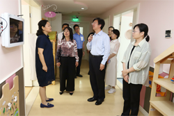 隨后,諾寶中心黨支部一行在兒康中心黨總支書記沈敏的陪同下,參觀了兒康中心的教學(xué)場所和康復(fù)設(shè)施。在兒童興趣康復(fù)教室,特教老師正在輔導(dǎo)聽力障礙的孩子們畫畫。孩子們看到客人后十分興奮,老師立即鼓勵(lì)指導(dǎo)孩子向客人表達(dá)歡迎,孩子們還為大家即興表演了唱歌。兒康中心作為上海市最早成立的綜合性專業(yè)康復(fù)機(jī)構(gòu),是國家首批省三級(jí)殘疾人康復(fù)中心,全國一類省級(jí)聾兒康復(fù)中心。近年來,兒康中心秉承全面康復(fù)理念,構(gòu)建了以殘疾兒童教育康復(fù)為主,醫(yī)教結(jié)合、康教并重的服務(wù)模式。通過對(duì)兒康中心的參觀,讓大家對(duì)殘障兒童的早期康復(fù)工作有了進(jìn)一步的了解,加深了對(duì)殘疾人工作的理解。