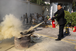 在隨后進行的消防器材使用方法集結(jié)點,安全消防員結(jié)合滅火器、火情處理案例向在場員工講解了引發(fā)火災(zāi)危險因素和滅火器的使用方法,指導(dǎo)大家遇到火災(zāi)時,要正確使用滅火器,嚴禁滅火器噴口對人。滅火器的使用方法為“一看、二搖、三拔、四噴”。一看,就是提起滅火器,看滅火器的壓力表,確認指針是否處于綠色區(qū)域范圍;二搖,就是將滅火器上下顛倒搖晃數(shù)次;三拔,就是一手抓下把手、一手拔保險銷;四噴,就是對準火的根部壓下把手,左右噴射直至把火撲滅。在室外使用滅火器時,應(yīng)選擇上風方向或側(cè)風方向進行撲救。按照消防員的講解,參演員工面對火災(zāi)起火點,手持滅火器,逐一演練了滅火技能。同時廚房員工也進行了滅火毯的操作使用。