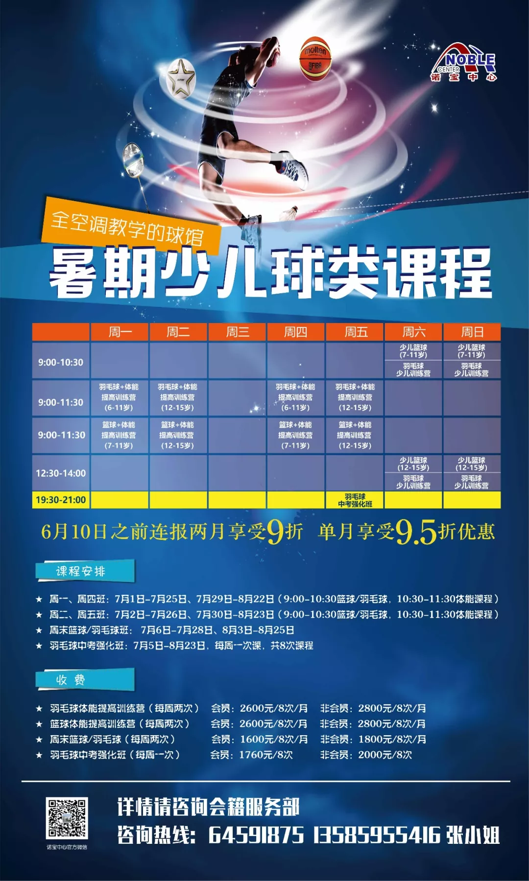 羽毛球+體能提高訓(xùn)練營 籃球+體能提高訓(xùn)練營 周一、周四班 7月1日-7月25日、7月29日-8月22日 周二、周五班 7月2日-7月26日、7月30日-8月23日 周末籃球班/羽毛球班 7月6日-7月28日、8月3日-8月25日 羽毛球中考強(qiáng)化班 7月5日-8月23日,每周一次課,共8次課程