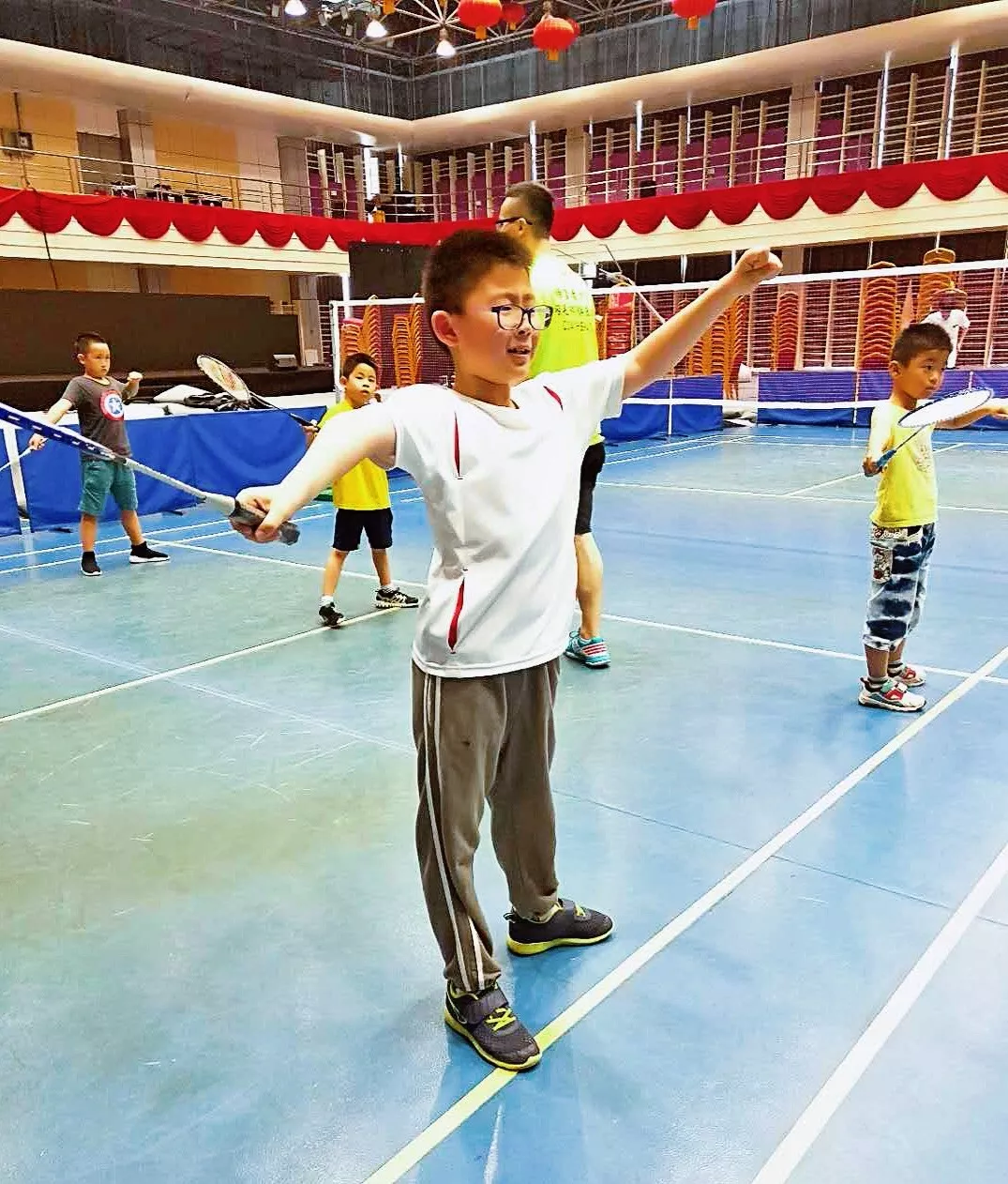 在球類館里揮動球拍,在藍色的泳池中閃動