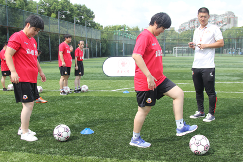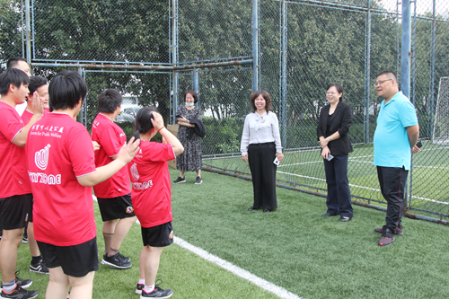 上午九點,聯(lián)誼活動正式開始。諾寶中心綠蔭場上陽光明媚,生機勃勃。中心合作單位愛和恩俱樂部的足球教練帶領(lǐng)陽光之家學(xué)員們一起進行足球康復(fù)訓(xùn)練,足球教練為學(xué)員們示范了足球基本步法等知識,組織學(xué)員們開展射門和分組對抗游戲,學(xué)員們隨著教練的口令和步伐,在球場上奔跑戲謔,充滿了歡聲笑語。
