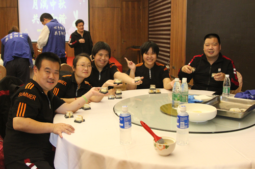 接下來的互動環(huán)節(jié)中心志愿者與學(xué)員們共同制作冰皮月餅。制作材料端上桌后,大家都摩拳擦掌、躍躍欲試。主持人先為大家簡單講解了一下制作過程,中心志愿者將月餅皮和紅豆、蓮蓉等餡料先分成一份份的,然后帶著學(xué)員們?nèi)囡炂?,包餡料,壓模子,大家分工配合,密切協(xié)作,有條不紊地進行制作,不一會兒,印著中秋字樣的冰皮月餅就呈現(xiàn)在大家面前。