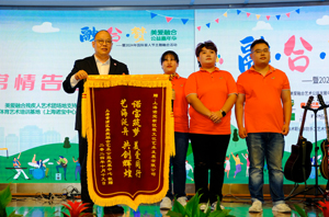 2019年10月,上海諾寶中心與上海黃浦區(qū)美愛融合藝術(shù)公益發(fā)展中心合建諾寶美愛藝術(shù)團(tuán),并連續(xù)5年為他們免費(fèi)提供固定排練場(chǎng)地?;顒?dòng)現(xiàn)場(chǎng),為感謝上海諾寶中心長(zhǎng)期以來對(duì)諾寶美愛公益事業(yè)的支持和幫助,主辦單位向上海諾寶中心頒贈(zèng)了致謝錦旗。上海諾寶中心董事長(zhǎng)張京津在接受錦旗時(shí)表示:上海諾寶作為中國(guó)殘疾人體育藝術(shù)培訓(xùn)基地,很愿意成為廣大殘障伙伴的家,歡迎殘障伙伴“?;丶铱纯础薄?/span>
