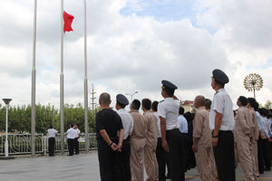 上午10時(shí)整,升旗儀式正式開始。參加儀式的全體人員整齊列隊(duì),三名安保人員組成的國旗護(hù)衛(wèi)隊(duì)踏著整齊劃一的步伐入場,在莊嚴(yán)的國歌聲中,鮮艷的五星紅旗冉冉升起?,F(xiàn)場人員莊嚴(yán)肅立,齊唱國歌,向國旗行注目禮,表達(dá)對偉大祖國最深情的熱愛,祝愿祖國母親更加繁榮昌盛。